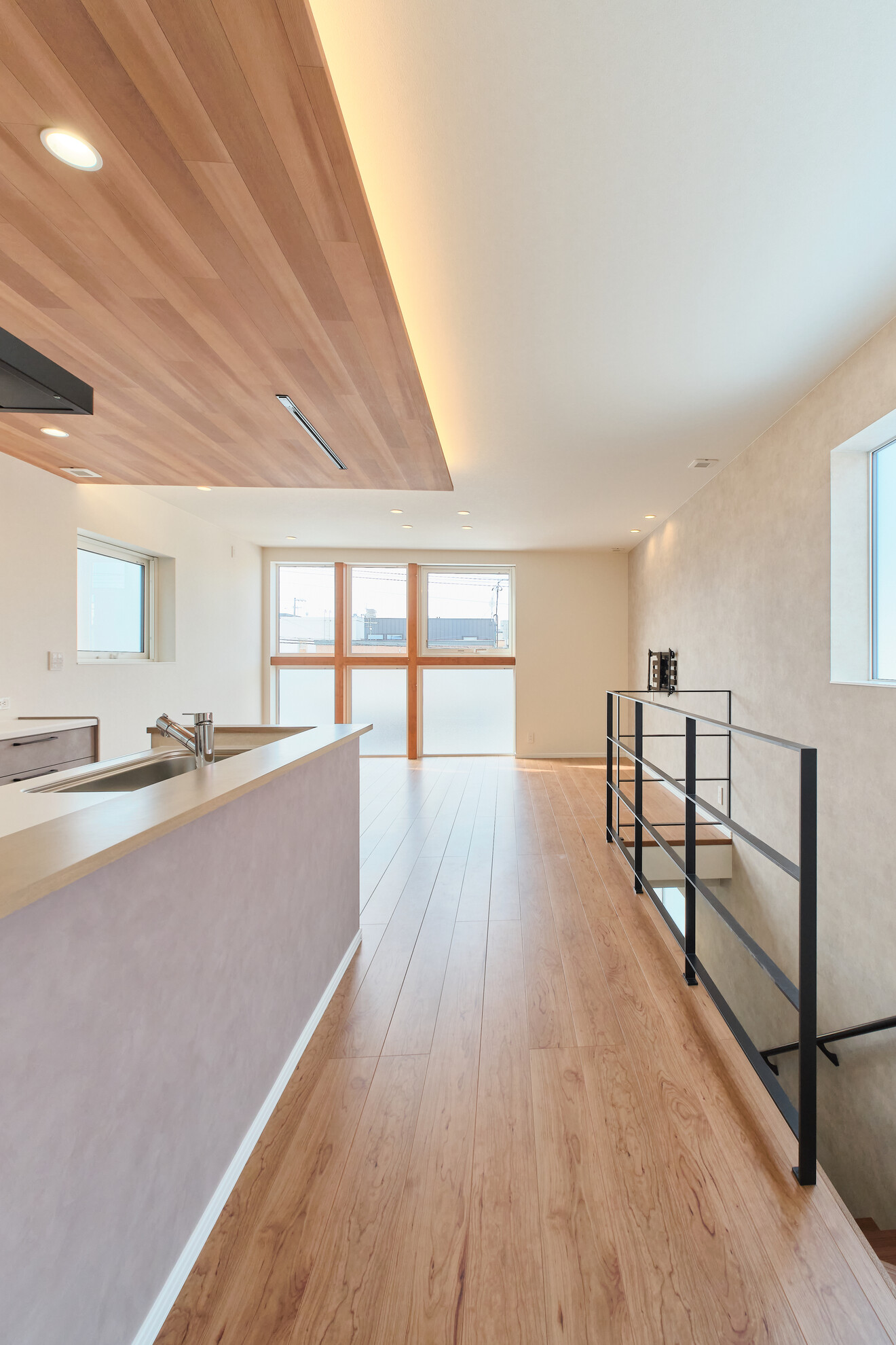 2階のリビングは標準より15cm高い天井高と、南面の大きな窓により、光あふれる開放的な空間に。